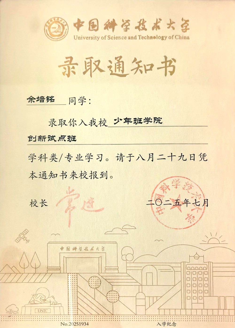 学长寄语:保持热爱,脚踏实地,奔赴理想 谈及此次成功考入中科大少创班,已经在中科大开始军训的余培铭表示,这离不开学校老师的悉心指导、父母的支持以及自己多年来的坚持和努力。同时,他也想给学弟学妹们分享一些自己的学习心得和感悟。 “高三是一段独特的旅程,它或许伴随着刷题的疲惫、考试的压力,但也孕育着无限可能。请记住,成绩和排名只是暂时的刻度,而你们对知识的好奇心、对未来的探索欲,才是驱动成长的根本。偶尔的挫折或许会让你迷茫,但正是这些时刻塑造了我们的韧性——就像科大“红专并进、理实交融”的校训所倡导的,既要追求真理的坚韧,也要拥抱实践的勇气。 在我看来,学习不仅是知识的积累,更是思维方式的锻造。试着跳出题海,去体会公式背后的逻辑之美;在紧张的备考中保持对世界的好奇,或许一道难题的解法就藏在你感兴趣的某个科技新闻里。少创班的学习经历让我深刻感受到:真正的创新源于扎实的基础与敢想的勇气,而高三正是培养这种品质的黄金时期。 当然,不必将未来视为必须精确计算的方程。人生的精彩往往源于偶然的探索与坚持——或许某个曾被忽略的学科会成为你未来的方向,或许某次失败反而让你遇见更合适的道路。珍惜身边的战友,感恩老师的指引,他们的陪伴会让这段时光熠熠生辉。 最后,请务必照顾好自己的身心。睡眠不足从来不是努力的勋章,适当的运动、一首单曲循环的歌、傍晚窗外的晚霞,都可能是支撑你前行的能量。 愿你们在奔赴山海的路上,既保有仰望星空的胸怀,也不忘脚踏实地的坚定。我们在科大等你,在更广阔的未来等你!”