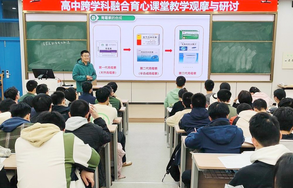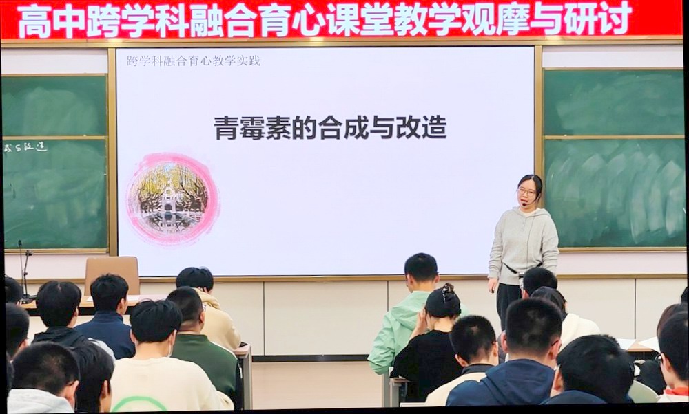 活动伊始,生物组徐婉玥老师和化学组李逸老师联袂登场,为全体青年教师呈现了一节高三跨学科融合育心课——《青霉素的合成与改造》。本节课以“青霉素的发现、合成与改造”为明线,以“科学精神培育、合作能力提升与责任意识塑造”为暗线,巧妙串联化学与生物两大核心学科知识,将育心目标融入学科教学的每一个环节。不仅实现了知识学习与价值引领的有机统一,同时对学生的心灵产生了“润物细无声”的积极影响。