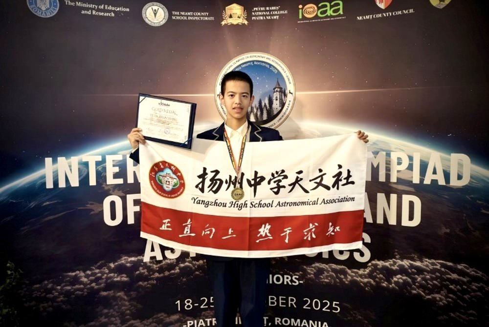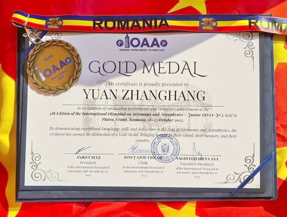 2025年10月18日至25日,第4届青少年国际天文及天体物理奥林匹克竞赛(4th IOAA-jr)在罗马尼亚皮亚特拉尼亚姆茨(Piatra Neamț)举行,本届赛事为历届规模之最,共吸引来自23个国家的112名学生参与。中国代表队在本届竞赛中表现优异,5名队员共斩获3枚金牌与2枚银牌。我校联培部英才D班袁张航同学荣获金牌,这是我校在国际天文奥赛中获得的第一枚金牌。
