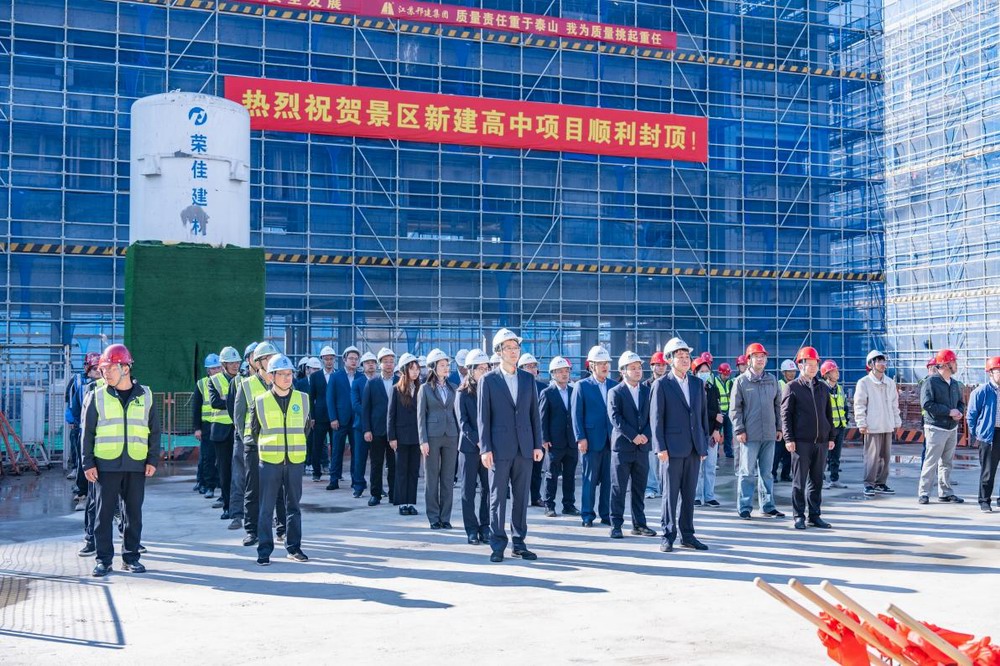2025年11月5日上午9点18分,随着混凝土吊运仪式的正式开始,景区新建高中项目封顶仪式顺利举行,扬州市政府副秘书长陈健,扬州中学党委书记薛义荣、党委副书记朱如忠,市教育局督导室副主任赵云,扬州科教集团总经理闫冬梅以及各参建单位的负责同志和我校教师代表出席仪式,共同见证了景区新建高中项目主体顺利封顶。