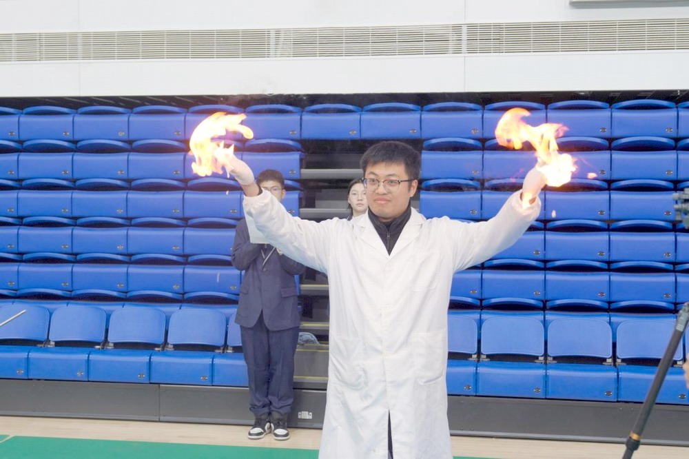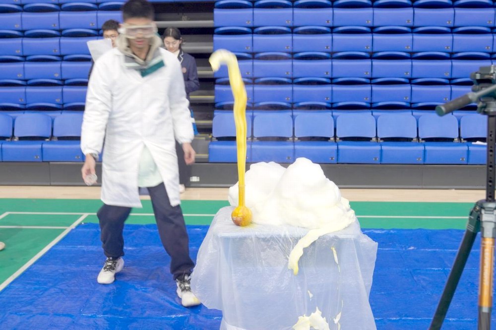 化学实验环节更是将氛围推向高潮。“火焰掌”表演中,丁烷气体被肥皂水泡膜包裹形成微型“燃料包”,点燃后剧烈燃烧却不伤手掌——水的高比热容与丁烷的快速燃烧形成完美协作,让同学们见识到科学调控的智慧。而“大象牙膏”实验则上演了一场“化学魔法”,过氧化氢在催化剂作用下快速分解,释放的海量氧气裹挟发泡剂,喷涌而出的巨型泡沫柱洁白蓬松,宛如为大象定制的超大号牙膏,引得全场惊呼不断,真切感受到化学反应的绚丽与力量。