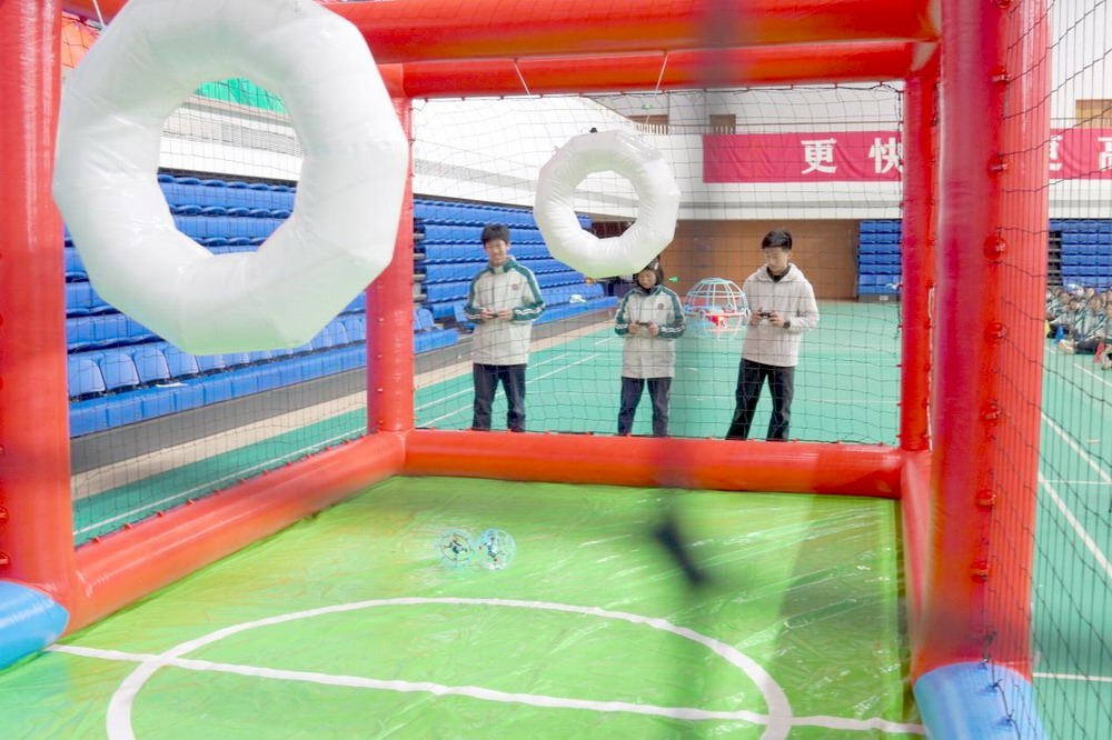 压轴登场的空中机器人足球表演赛成为最大亮点。高一(2)班与高一(7)班代表队操控无人机展开激烈对抗,作为近年兴起的空中对抗性项目,无人机灵活穿梭、精准攻防,模拟着“魁地奇”般的奇幻场景,选手们的精彩表现既展现了扬中学子的科技素养,也为后续的对抗赛拉开了序幕。