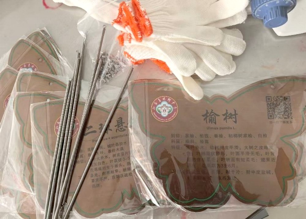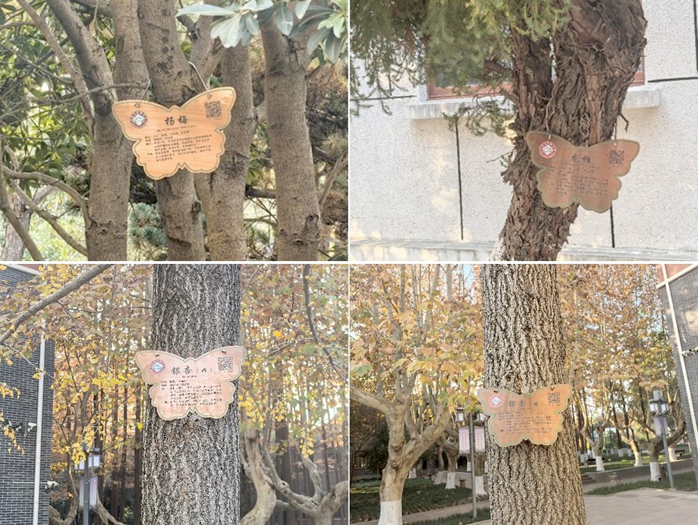 巧思设计名牌,让植物“会说话” 确定入选品种后,老师们聚焦挂牌的实用性与人文关怀,反复打磨设计方案。为不影响树木生长,特意选用弹簧绳,预留充足的生长空间;名牌上不仅印有扬州中学专属logo,彰显校园特色,更嵌入了科普二维码——扫码即可解锁植物的详细习性、生长周期、文化寓意等延伸知识,让小小挂牌成为“移动科普站”。地理组负责名牌的沟通与定制,全程兼顾美观度与实用性,每一处细节都彰显着“尊重自然、服务师生”的活动初心。