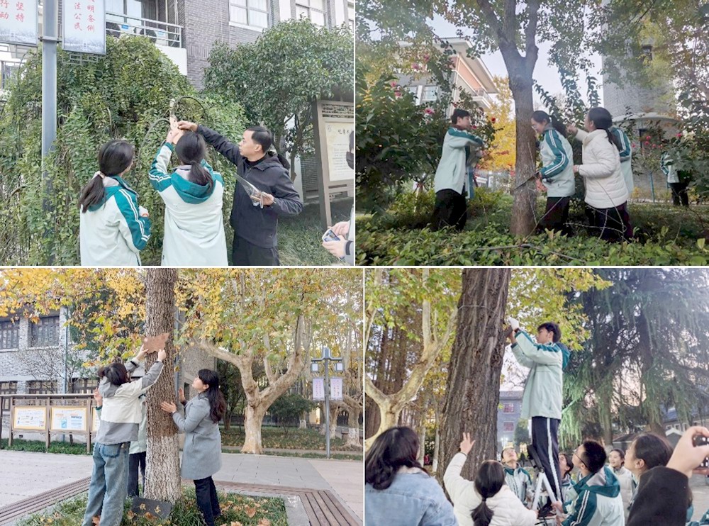 亲手挂牌认草木,校园添上“科普标” 11月26日社团活动课上,生物社的同学们在老师们的带领下,带着定制好的名牌来到室外。大家分工协作,小心翼翼地将名牌固定在对应的植物上:有的核对植物名称与位置,有的调整弹簧绳松紧以保护树干。当一张张印着校徽、颇具设计感的名牌,错落有致地挂在枝干上时,原本熟悉的校园瞬间多了许多“科普标识”,每一株草木都成为了可互动的“自然老师”。