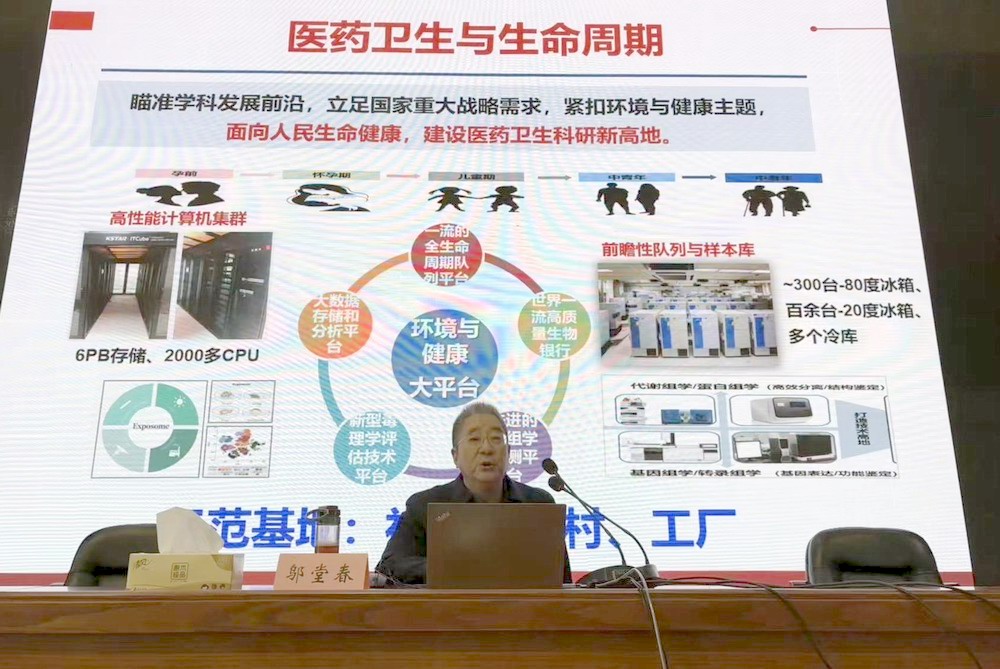 讲座伊始,邬院士从“美好生活”的愿景出发,强调了健康在国家发展与个人幸福中的基础性作用。他结合党的二十大精神,阐述了卫生健康事业对满足人民群众美好生活需要的重要意义,并围绕心血管疾病、呼吸道疾病等常见健康问题,深入浅出地讲解了健康管理与疾病预防的紧迫性。 然后,邬院士以矿尘危害治理、燃料燃烧与健康关系等实际案例,生动展示了公共卫生干预的科学力量与实际成效。他特别关注青少年健康成长,提醒同学们重视睡眠质量、积极参与体育锻炼,养成科学健康的生活方式。